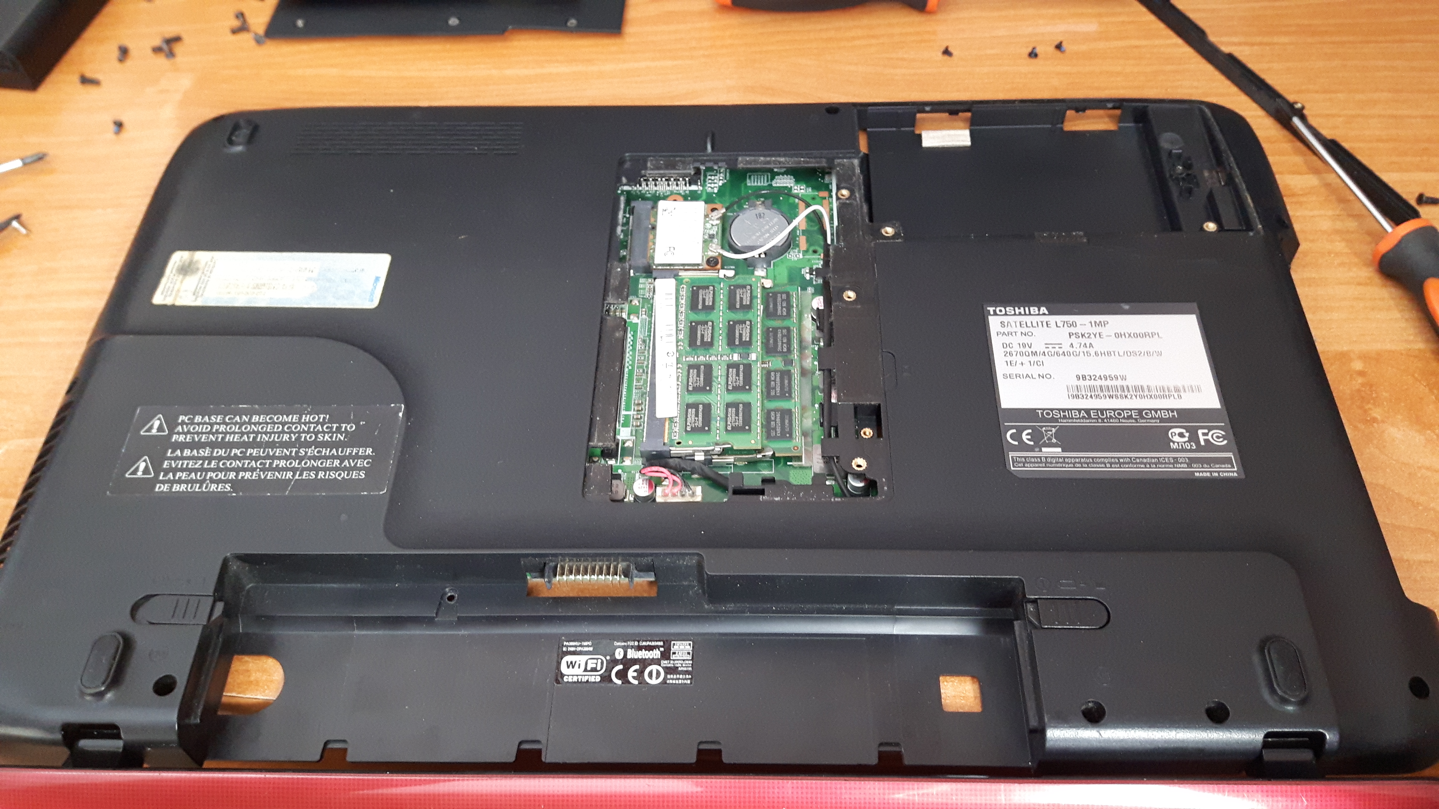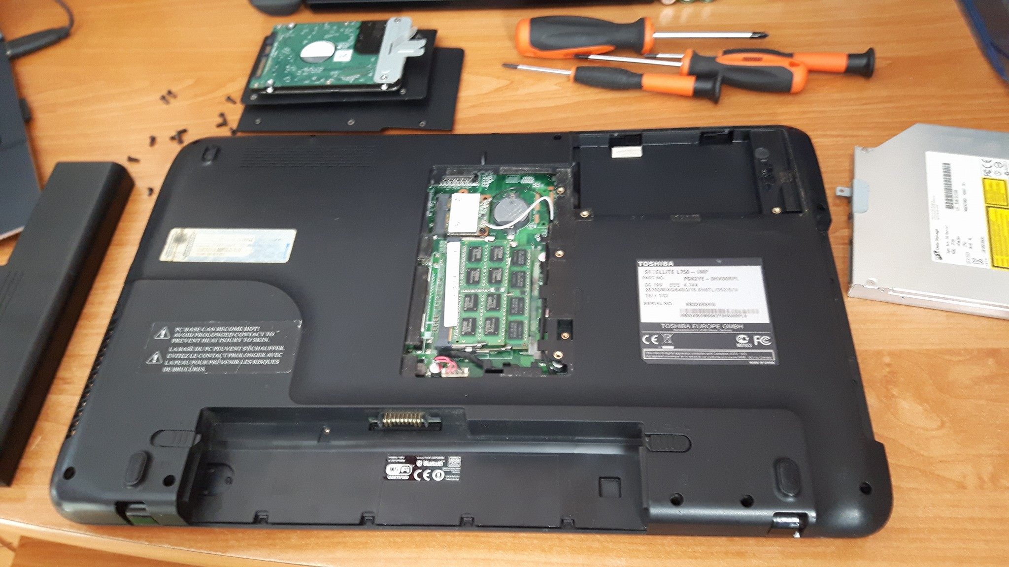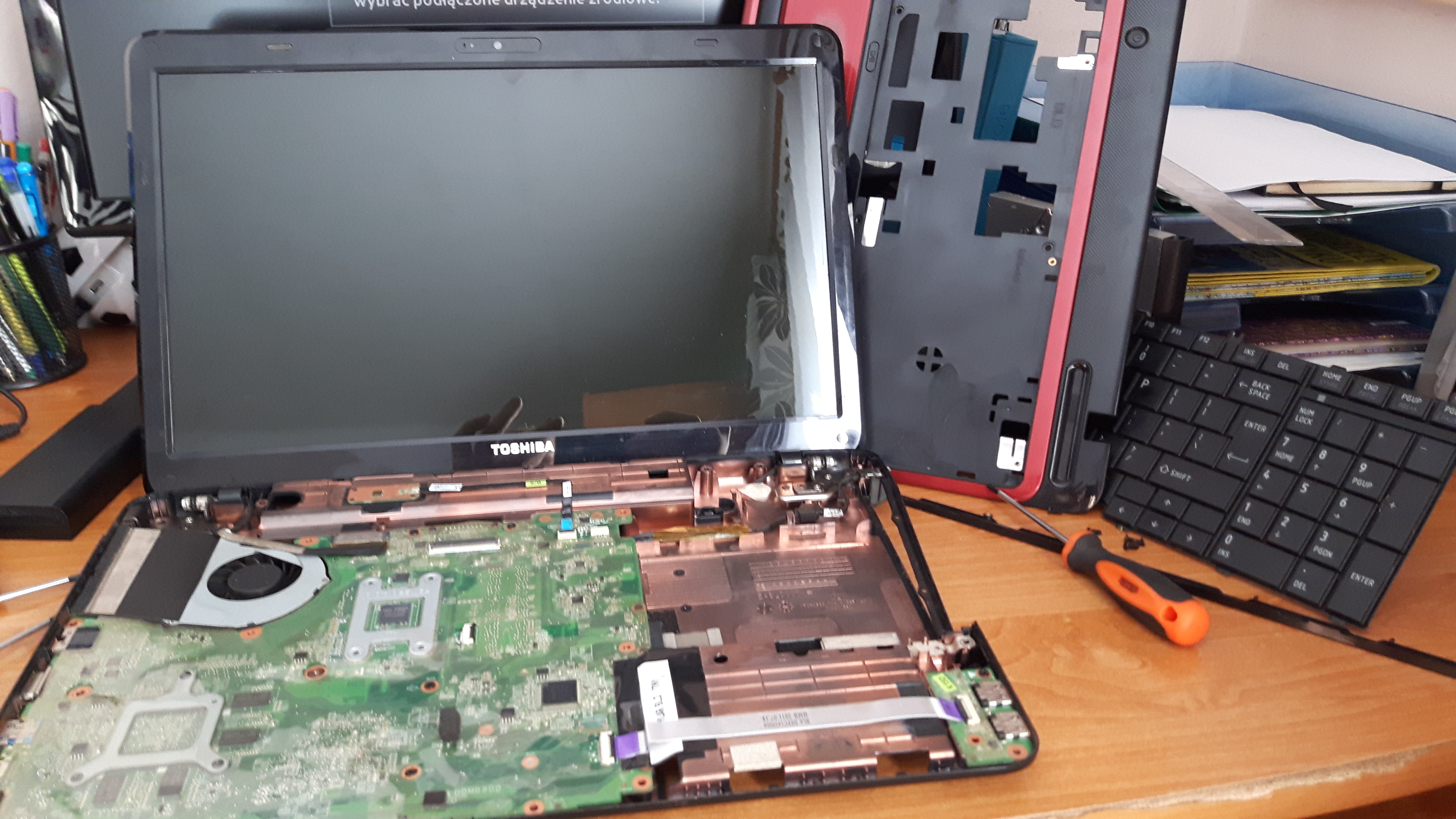 Kolejny laptop na warsztacie, tym razem Toshiba Sattelite – typowe objawy kilkuletniego sprzętu: głośno huczy, grzeje się, czasem sam restartuje, ekran ciężko się otwiera i skrzypią zawiasy, bateria nie trzyma bez zasilacza. Laptop rozłożony na czynniki pierwsze, dokładnie wyczyszczony z kurzu, odetkane otwory wentylacyjne, wymieniony wiatrak procesora z powodu nadmiernie wysłużonego łożyska, wyczyszczone i przesmarowane zawiasy, dołożona pamięć ram, na koniec wymieniona bateria na nowa o większej pojemności. Sprzęt odzyskał swoją młodość, gdyż miał niezłą konfiguracje i posłuży jeszcze długo.